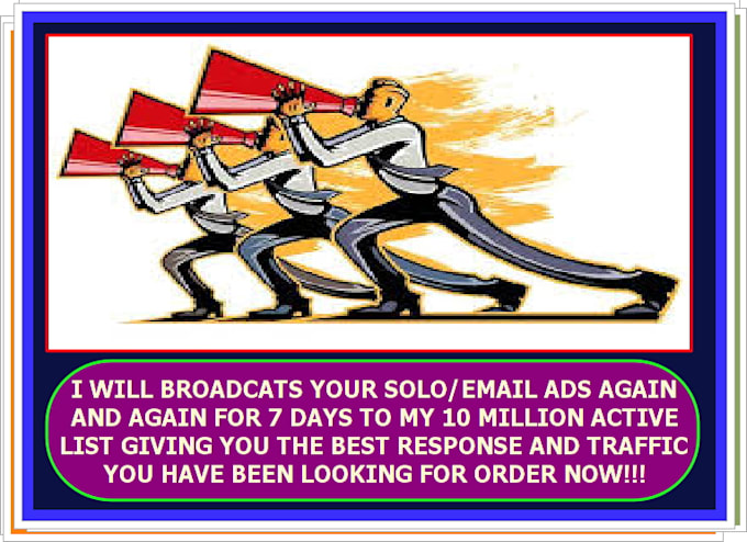 !!!YEARR GUARANTEED 1,800!!! CLICKS AND WORK SATISFY...Earn Massively and continuously..I will BROADCAST Your SOLO Ads And Email Ad Continiously for 7 working days in the day time To over 12 million mostly USA Responsive Real List solo ad swipe, email ad swipe, swipe, copywriter, solo ad writer, solo ad, email ad. Yes! i shall write your solo ad and email ad for promotion to solo ad sellers to ensure more CLICKS and SALES as a professional. I have a lot of experience when it comes to CONVERSION and writing quality solo ads. I work with hundreds of solo ad advertisers with dozens of solo ad swipes that converted marvelously.am sure you will be very satisfied with my service.PLACE YOUR ORDER NOW!!! And Bonuses will also be coming your way that's how we treat our custormers ORDER NOW!!Reviews