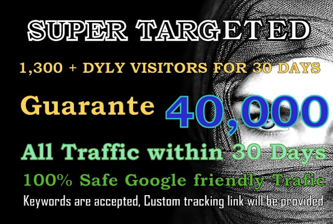 I guarantee and responsible to drive SUPER TARGETED WEB TRAFFIC to your website for 30 days. Basic gig offer 40,000 traffic in 30 days and There are many packages for more hits